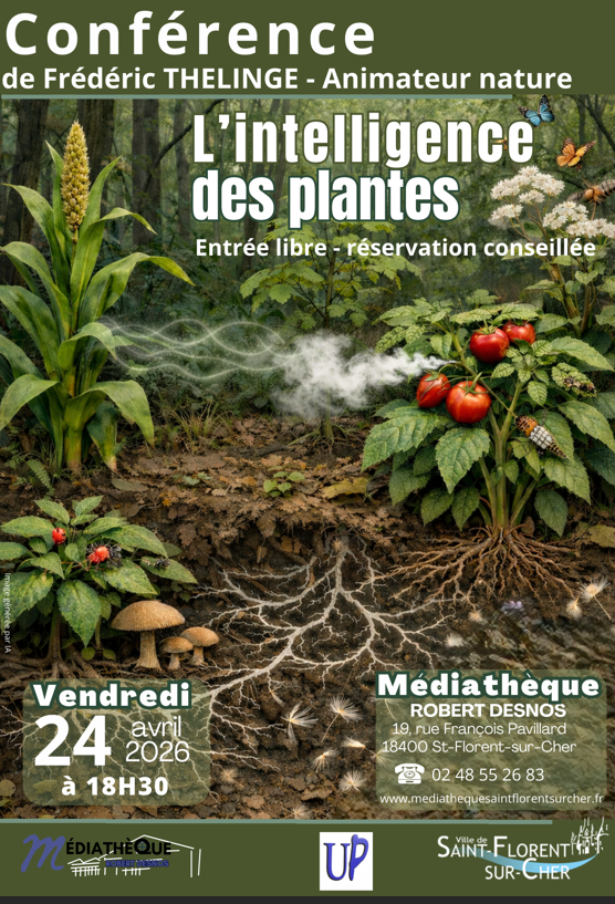 Pour en savoir plus sur la manière dont les plantes s’adaptent à leur environnement, Frédéric Thelinge, animateur nature, vous convie à une conférence sur L’intelligence des plantes en partenariat avec l’Université Populaire du Berry, le vendredi 24 avril 2026 à 18H30 à la médiathèque de Saint-Florent-sur-Cher.