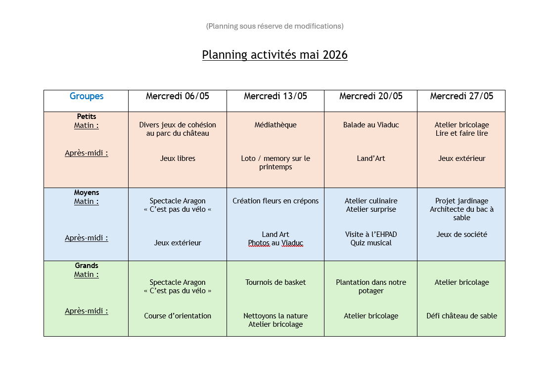 L'accueil du mercredi est ouvert en période scolaire sauf pendant les vacances scolaires. Il peut recevoir 20 enfants de 3 à 6 ans et 36 enfants de 6 ans à 11 ans révolus.